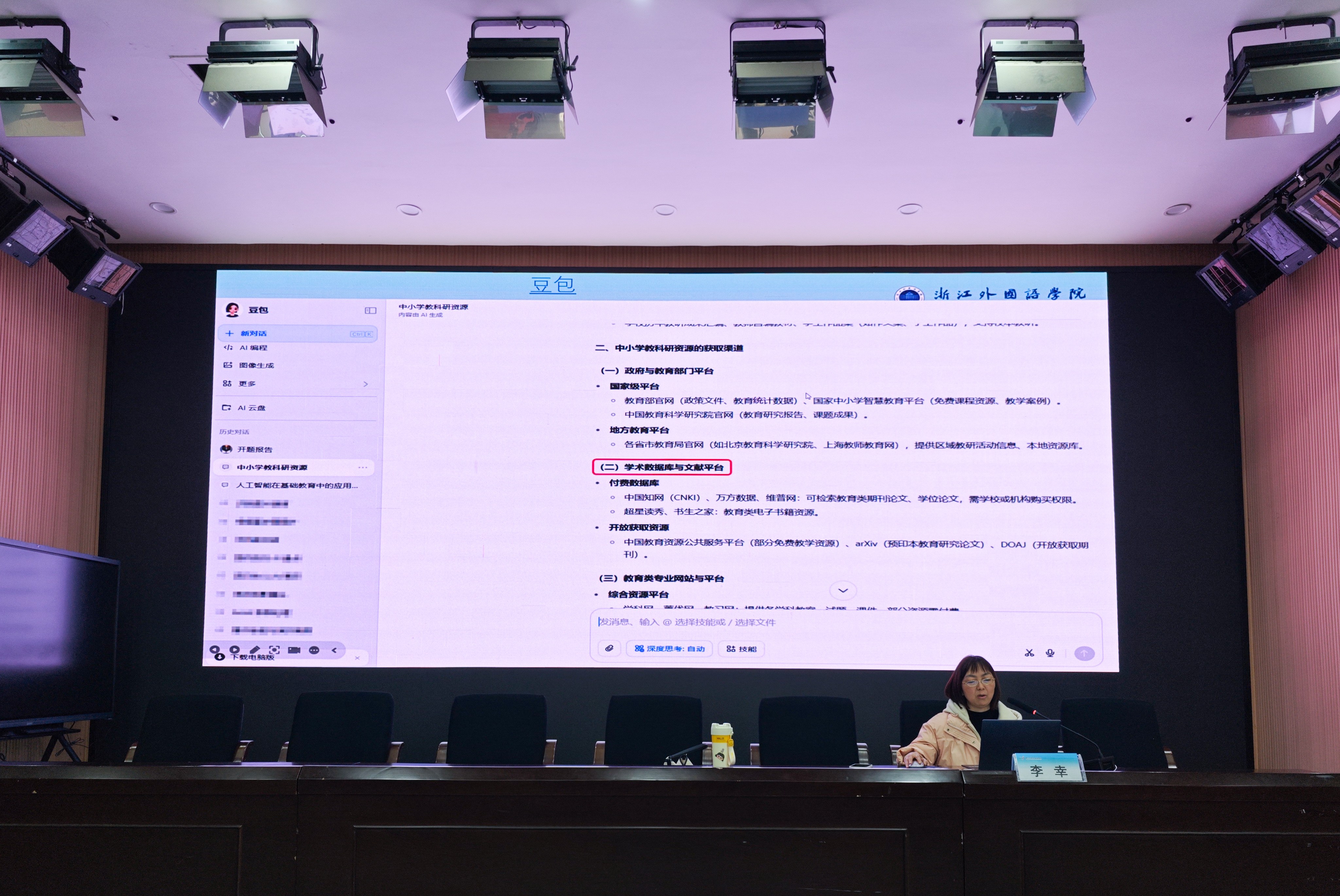 在AI工具应用教学环节,李主任结合教育领域典型案例,直面AI生成内容可能存在的信息失真、参考文献虚构等风险,强调教师需树立审慎态度与批判性思维,掌握精准提问技巧与多源交叉验证方法。通过现场演Deepseek、Kimi等工具说明其在课件制作、教学设计、文献整理等场景的辅助应用,同时严守学术规范底线,明确要求在论文撰写、成果发表等工作中如实标注AI参与情况,确保学术研究的真实性与严肃性。此外,李主任还推介台湾学术文献数据库、PubMed等中外特教专业平台,分享主题检索、同义词扩展、干扰信息排除等高级检索技巧,助力教师拓宽专业视野,精准追踪国内外特教前沿动态,提升教学科研效率。